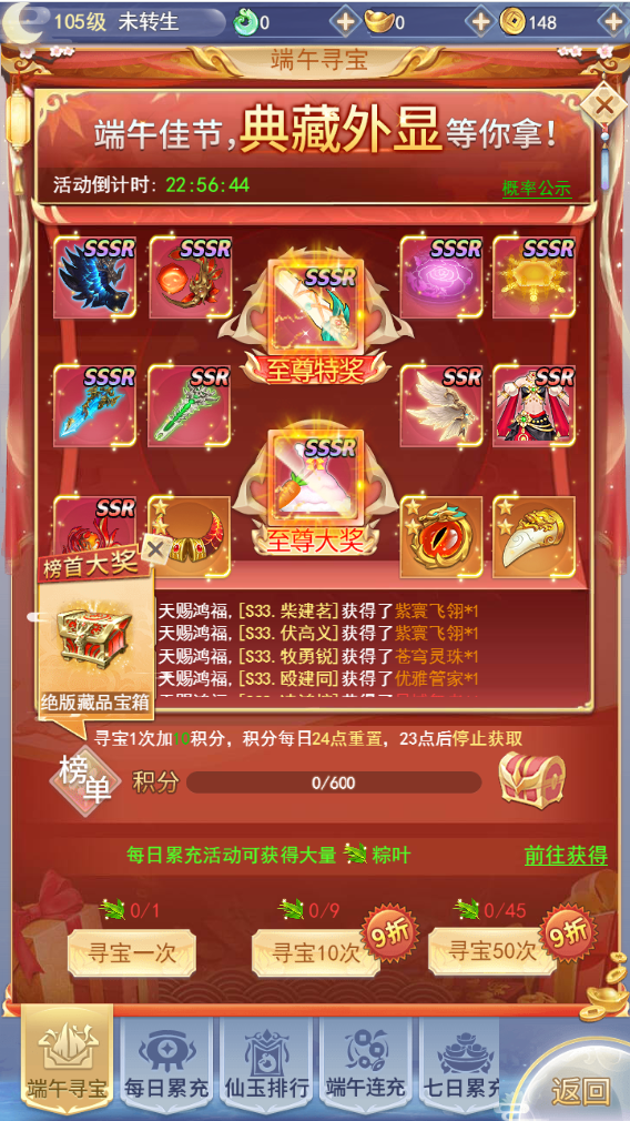 使用道具【粽叶】即可参与寻宝,每寻宝一次可获得10积分,积分用以参与积分排行和领取积分达标奖励!