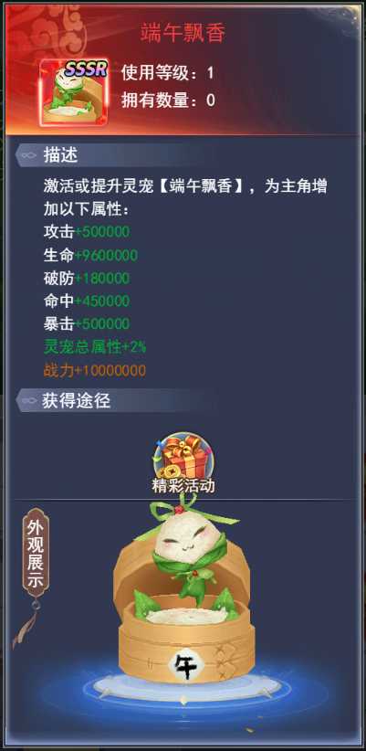 5、榜单有持续时间,活动期间内,总共会有两次榜单内容。龙舟起航榜首大奖包含灵宠【端午飘香】