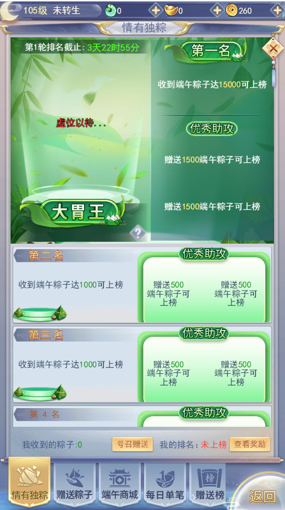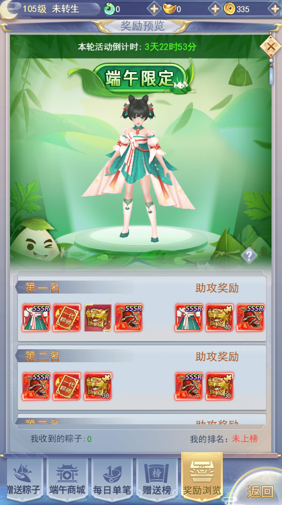 收集榜前三的奖励包含了节日时装【端午粽情】以及称号【一代粽师】!赠送榜前三的奖励包含称号【我只粽意你】!