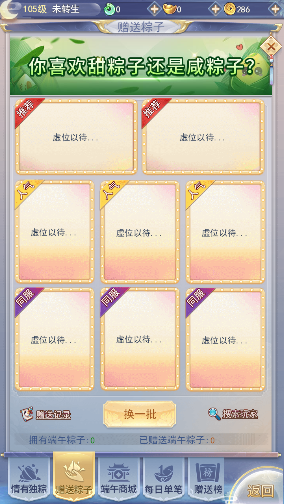 玩家可以通过赠送面板、仙盟频道超链接、九州频道超链接、仙侣频道超链接、本服频道超链接互送【粽子】