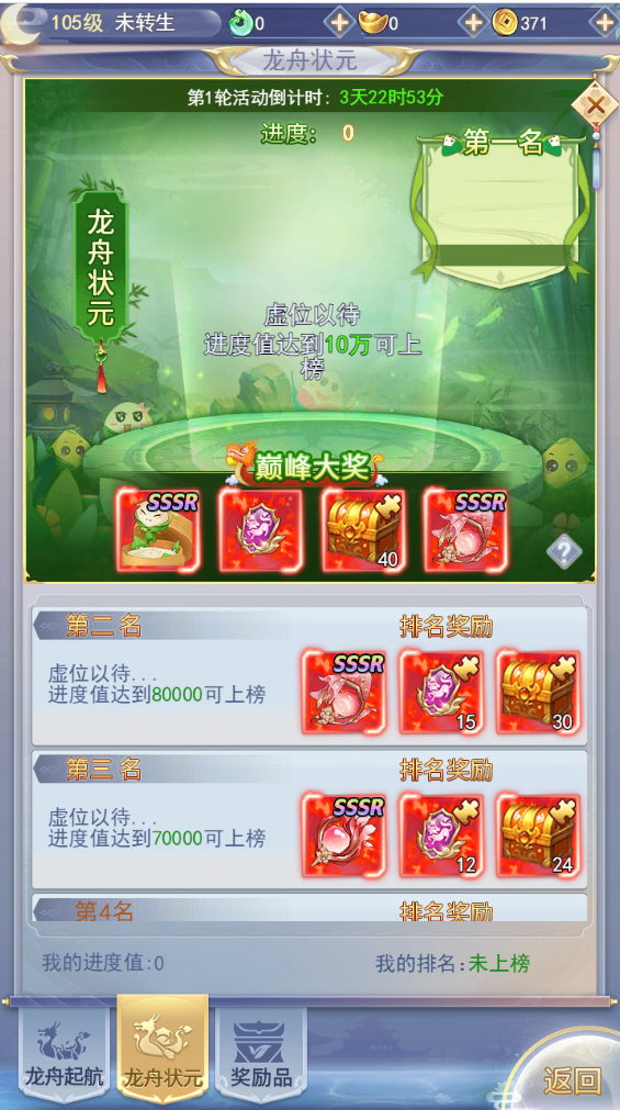 4、个人龙舟进度排行上榜玩家可获得排行奖励。区服龙舟进度排行上榜的区服的玩家的龙舟进度达到要求可领取区服排名奖励。
