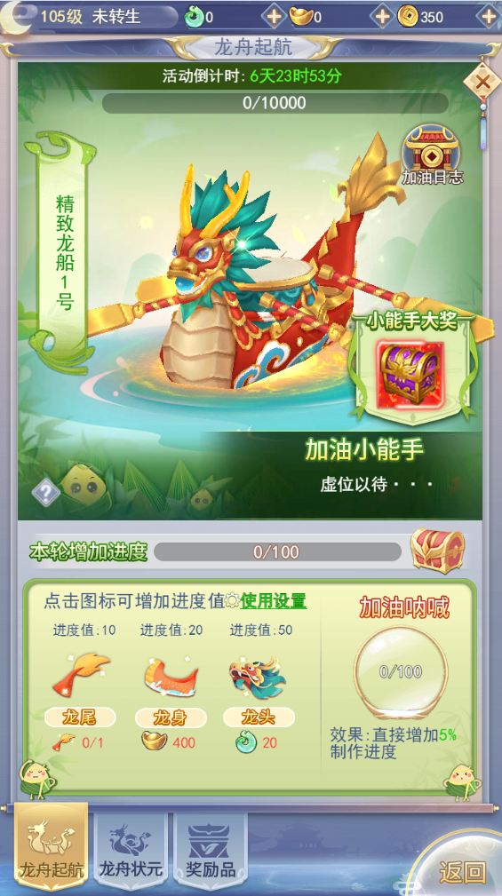 3、对每个龙舟的制作进度达到一定条件后可领取阶段奖励,制作进度满后重新计算下个龙舟的阶段奖励。累积龙舟制作进度达到要求后可领取龙舟阶段奖励。
